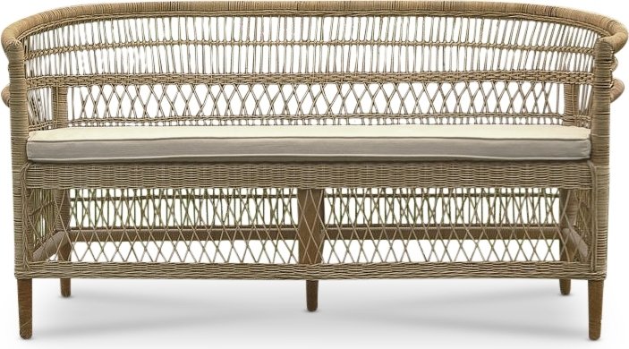 Sofa i naturrotting med pute i lyst stoff. Naturrotting bør beskyttes og er ikke egnet for utendørs bruk.