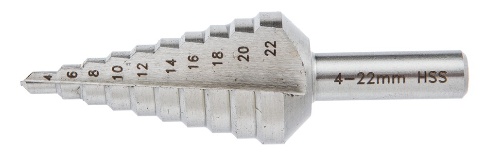 Trinnbor av fast stål. For boring og oppriving av hull i stålplater, aluminium, kobber og biter av plast.