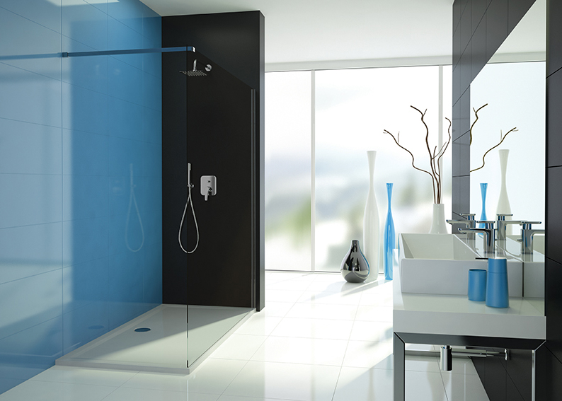 Dusjvegg - flere valgbare bredder mellom 70-140 cm. Glasset i veggen er laget av herdet sikkerhetsglass med beskyttelsesglass som standardalternativer. GLASS PROTECT glassbeskyttelse er en overflatebehandling som gjør at vannet renner lettere av og etterlater seg mindre kalk og smuss. Kan monteres til venstre eller høyre. Leveres med stag og vegglist/veggfeste.
