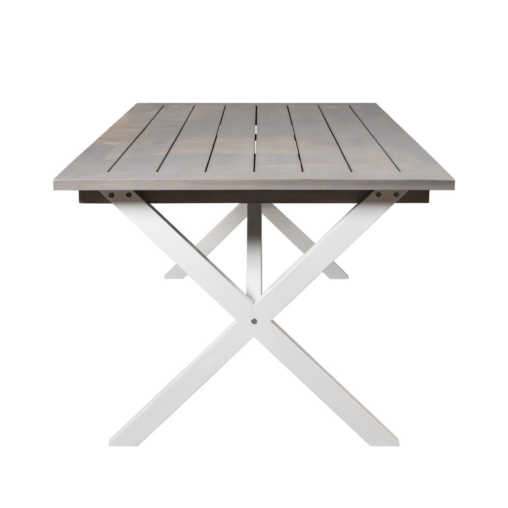 Spisebord i furu til utemøbler med grå bordplate og hvitt understell. Bordet har kryssben og en bordplate laget av planker, noe som gir det et robust og karakteristisk utseende. Hagebord som passer godt i vinterhagen og på terrassen.