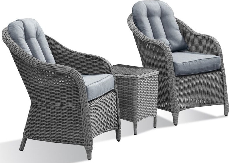 Lenestolene er laget av rotting med fyldige puter som underlag. Bordet som følger med er laget av matchende rotting og har glassplate.