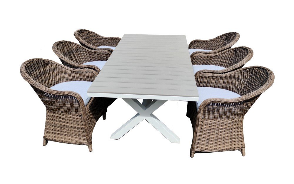 Mercury er en utemøbelgruppe med nydelig kunstrotting som gir en nøytral følelse av natur. Fargene gjør møbelgruppen passer inn i de fleste miljøer. Lenestolene er romslige og det følger med pute til settet. Rammen for møbelgruppen er av stabil og lett aluminium. Ideell for minneverdige øyeblikk med familie og venner på terrassen eller i hagen.