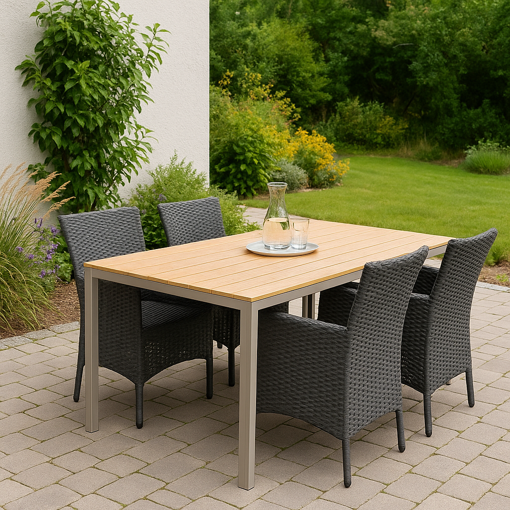 Den pulverlakkerte aluminiumsrammen er både lett og rustfri, mens Aintwood-bordplaten gir en trefølelse uten behov for vedlikehold. Den grå syntetiske rottanen på Ida-stolene motstår både regn og UV-stråling, noe som gjør stolene optimale for nordisk klima og langvarig bruk.