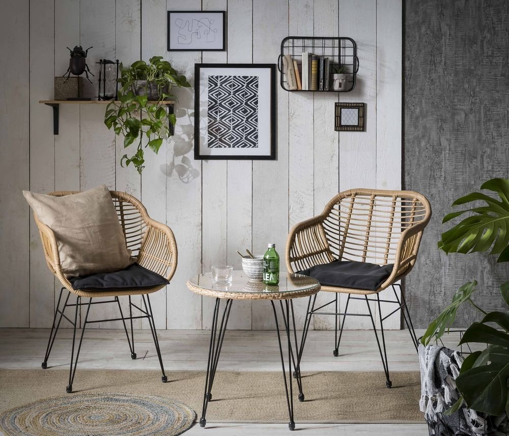Utemøbelgruppe i naturfarget kunstrotting med svarta ben av metall. Sett med 2 lenestoler samt et bord. Topplate på bord av glass.