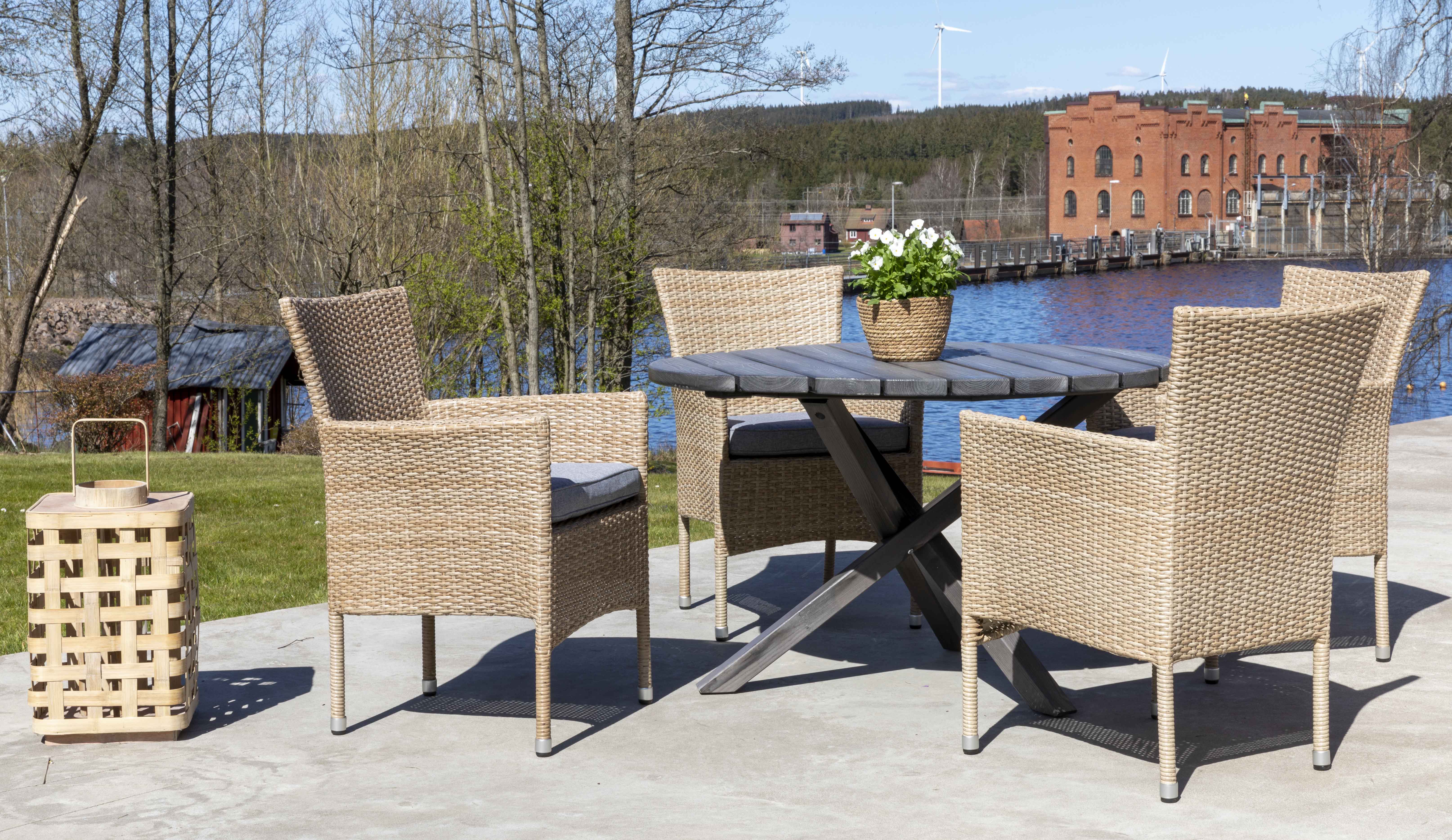 Vancouver spisegruppe gir deg en utemøbelgruppe i nøytral naturfarget kunstrotting som passer fint i hagen. Møbelgruppen består av et rundt solid spisebord med 4 stk. matchende komfortable lenestoler med puter.