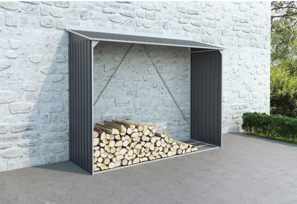 Vedskjul laget i motstandsdyktig galvanisert stål med en kraftig konstruksjon. Bunnsviller gjør at veden kommer opp fra bakken for ytterligere beskyttelse.