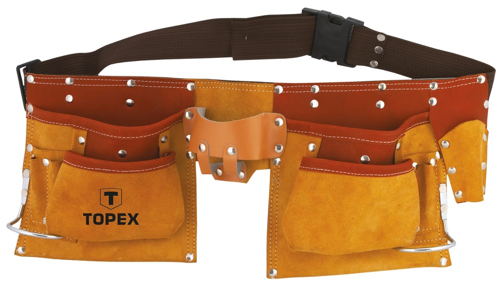 Verktøybelte av lær som kan justeres, med 11 praktiske lommer.