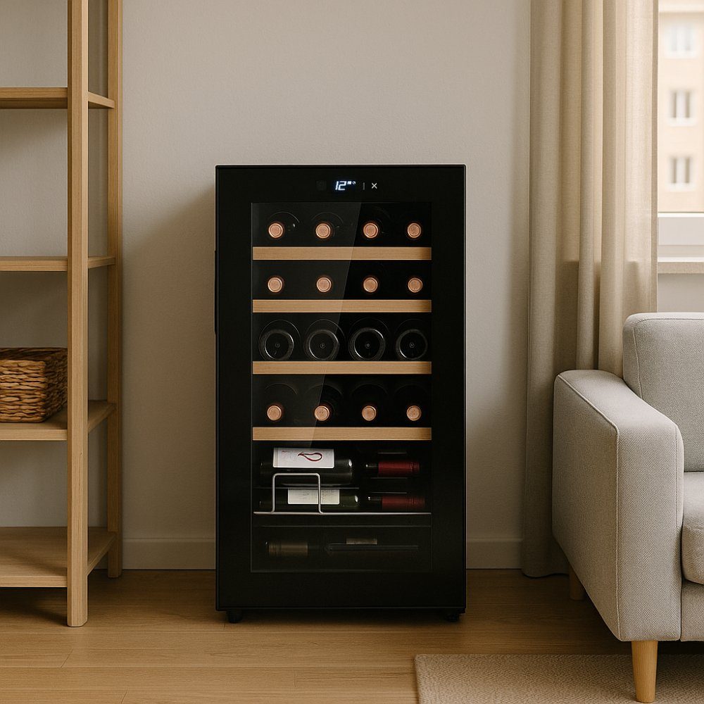 Oppbevar og server vinen din med stil og presisjon. Dette kompakte og elegante vinkjøleren i svart utførelse har plass til opptil 24 flasker og er utstyrt med en stillegående kompressorkjøling med fast frekvens. Med sitt moderne design, LED-belysning og funksjonelle detaljer passer den perfekt som en frittstående enhet på kjøkkenet, i stuen eller i vinkjelleren.